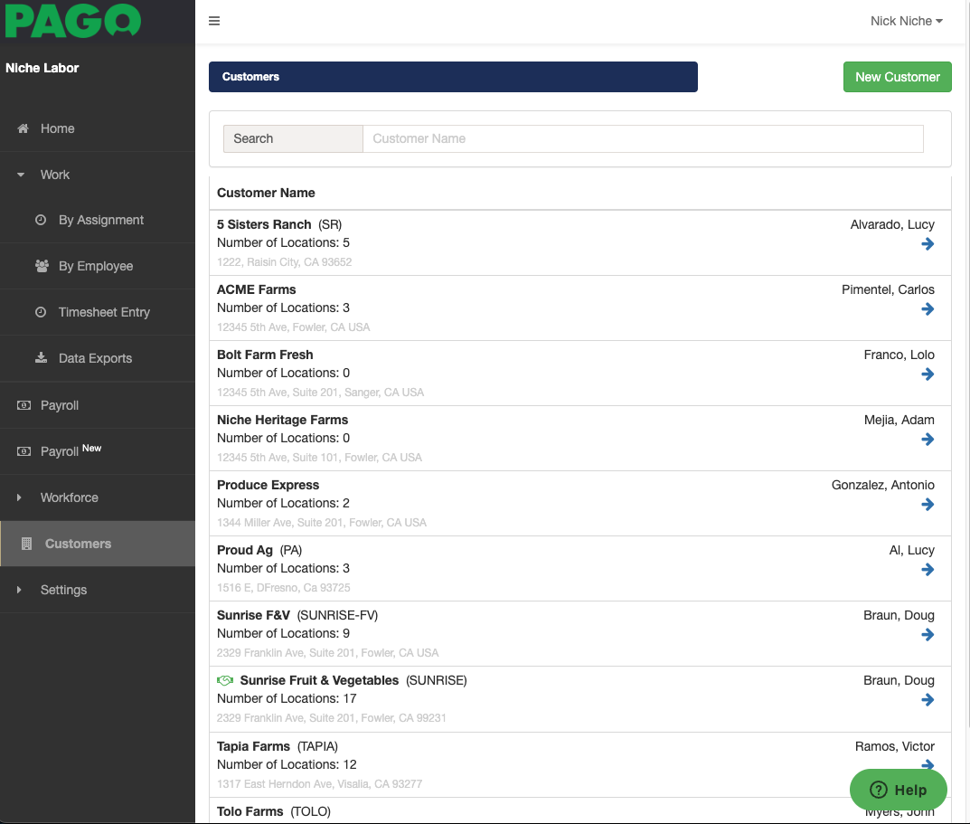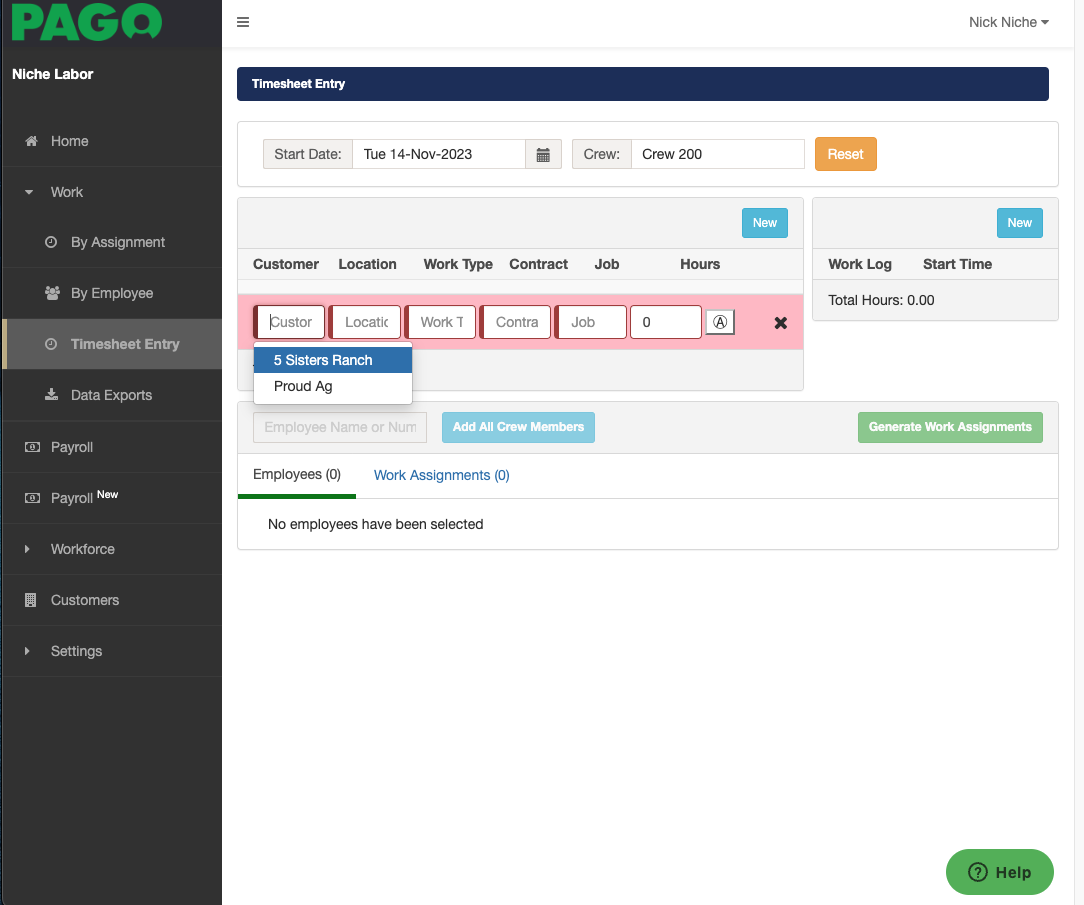 When missing a customer in creating a timesheet entry is because we may have forgotten to associate a crew to a customer. (Missing ACME Farms)