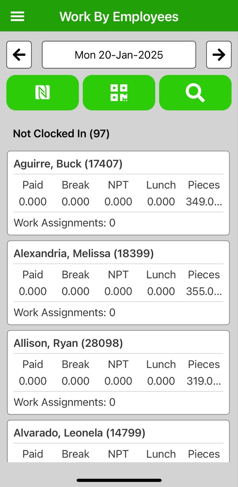 Once in the Work By Employees page you can use an NFC scan, a QR code scan or a Search to select an employee to clock-in. You can also tap on the employee if they are visible in the list.