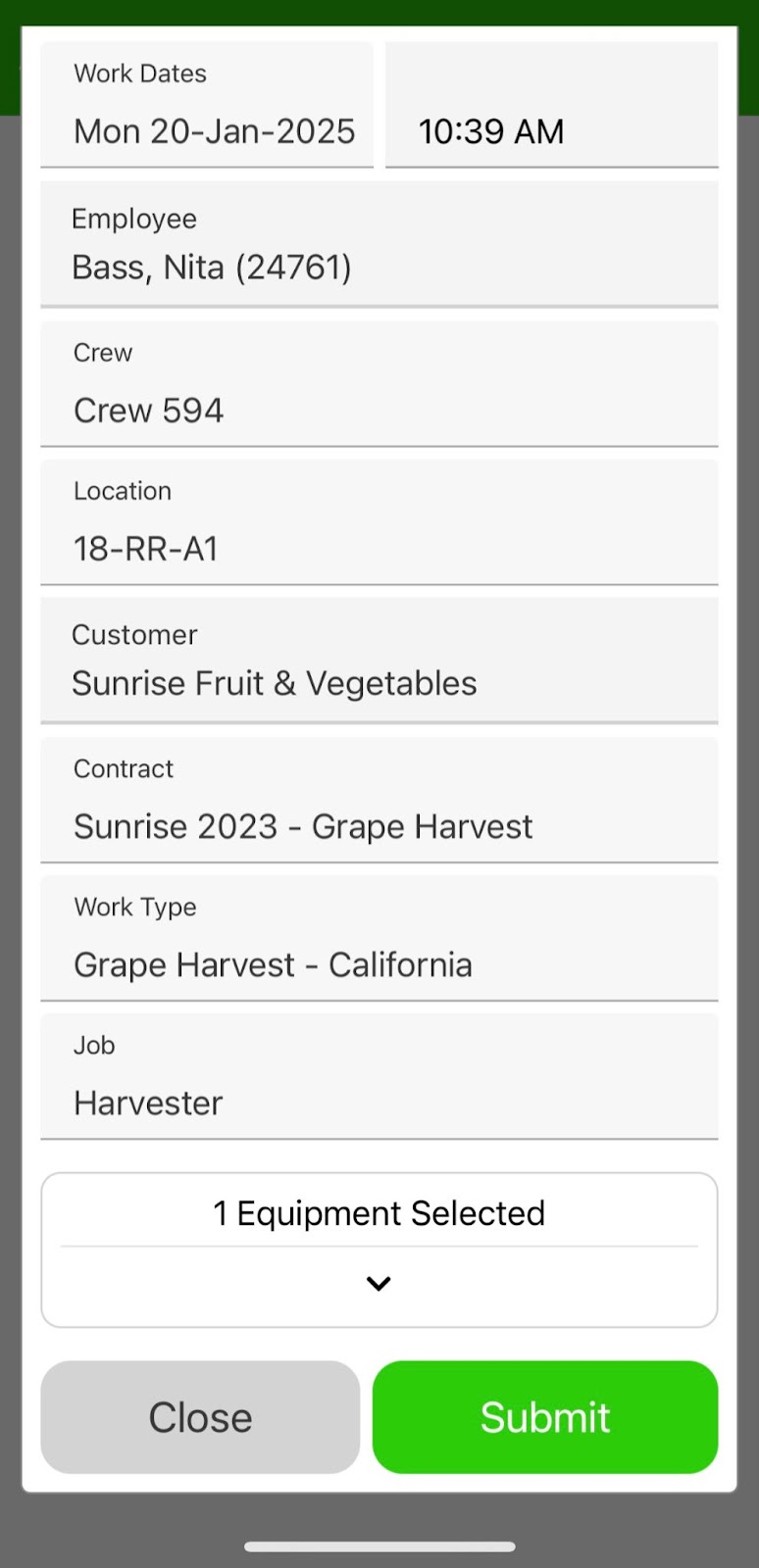 Fill in the screen with the selected values for the employee clock-in (location, job, equipment, etc.) Tap the Submit button when finished and Pago will automatically create a work assignment and add the employee to it.