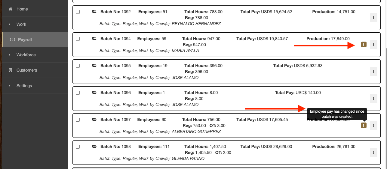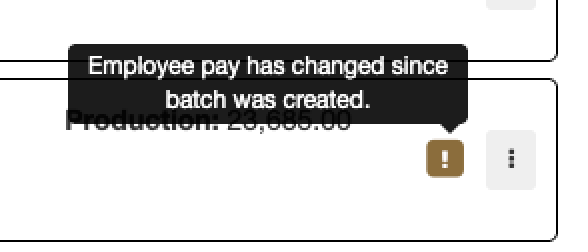 If you ever see brown exclamation marks in your payroll file. This indicates an employee’s pay has changed since the batch was created. In order for the update to take effect, you would need to delete the payroll batch and recreate it.